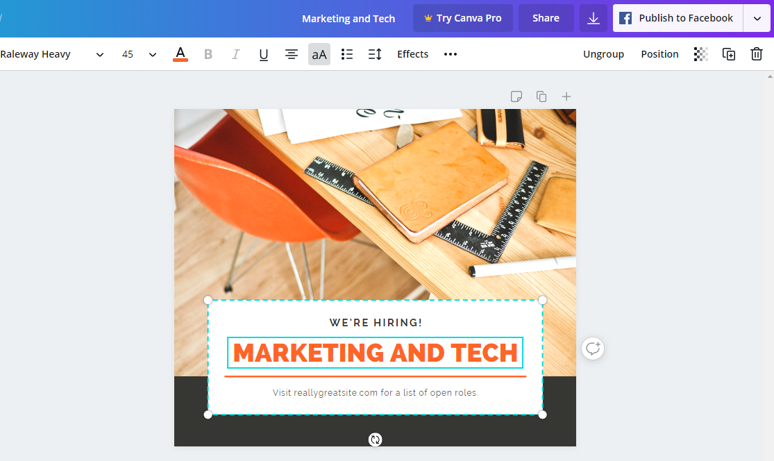 So you’ve decided to use one of Canva’s many templates – now what? Time to get creative! As an example, we’ve selected a Facebook Post template below.